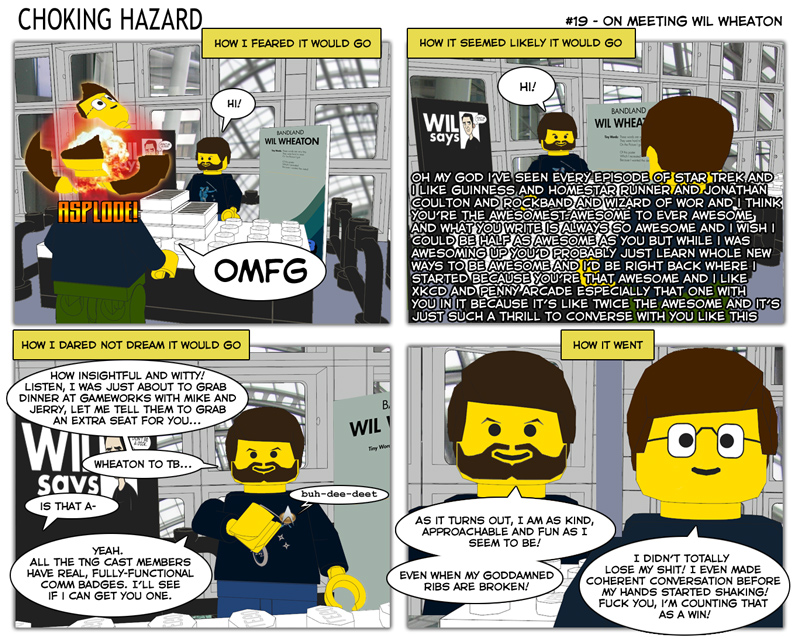 Wil Wheaton is fucking awesome. This strip is reconstructed from photos of the event itself, culminating in this shot – yes, that is me with Wil fucking Wheaton. I had fully expected to completely lose the ability to marshal coherent thought, and expressed as much in a comment on Wil’s blog. As it turned out, despite a raging onset of Shaking-Hands-With-A-Fuck-Ton-Of-People-Ebola, and severe rib pain, Wil was a totally amazing, stand-up guy, and I managed to convey some very important things to him and not drool or scream uncontrollably even once. It was nawesome, which is the first born son of hawesome and awesome. The top of the h appears to be recessive.